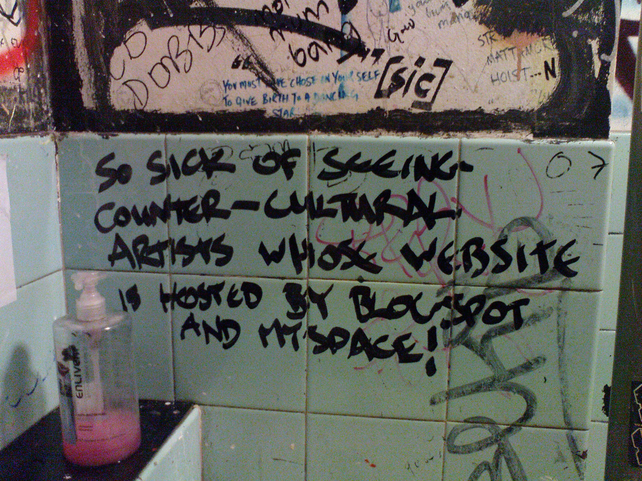 Literate graffiti making a point about internet culture, art and protest in the foulest toilet in Old Street (The Foundry).